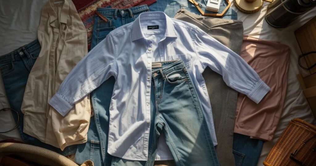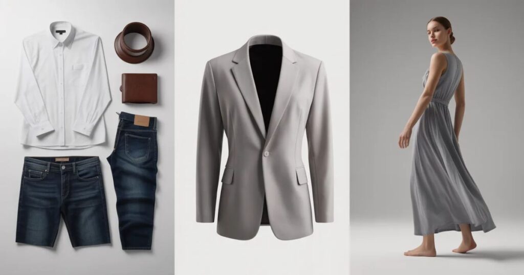 Flat lay clothing photography involves placing garments on a flat surface and capturing them from above for a clean, minimal look.