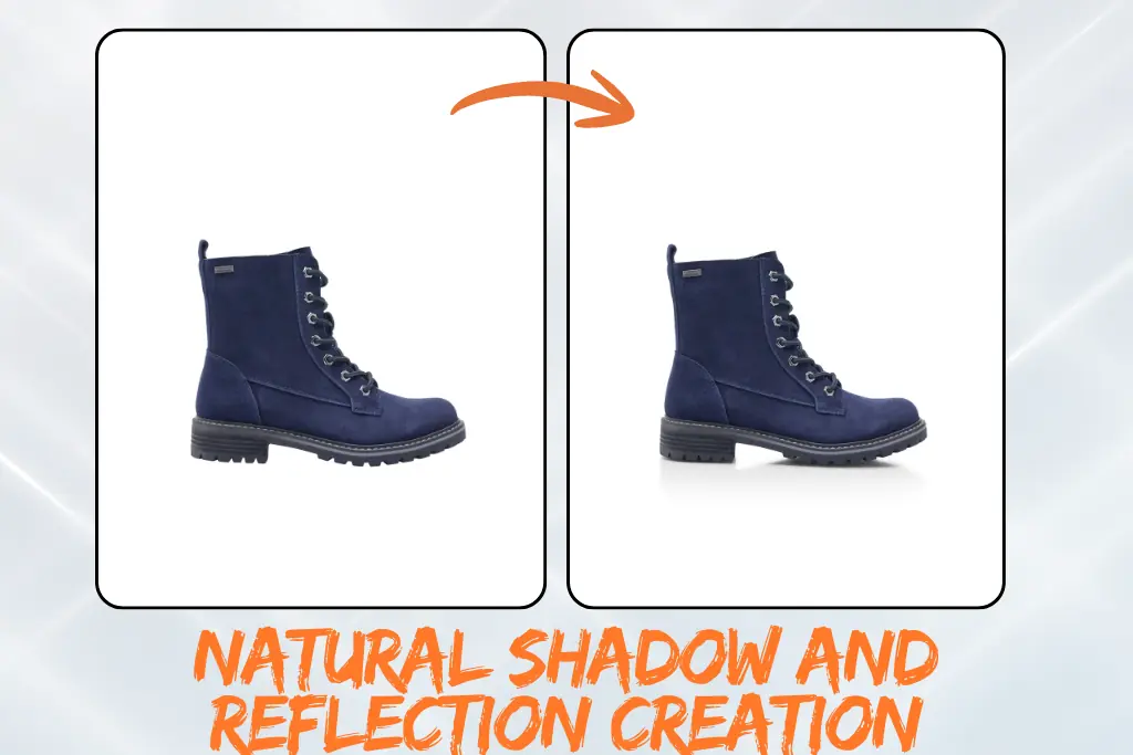 We create natural-looking reflection shadows beneath your footwear to give it a sense of depth and dimension. This helps the shoe appear grounded and more realistic, especially on white or transparent backgrounds. The result is a polished, studio-quality image that elevates your product’s presentation.